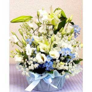 お供え 花 お彼岸 初彼岸 ユリ カサブランカ とライトブルー可憐なアレンジメント 花かご お悔やみ 喪中 喪中見舞い 新年 爆買