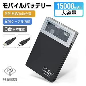 モバイルバッテリー 軽量 小型 15000mAh大容量 PD 22.5W急速充電 薄型 コンパクト 持ち運び便利 Type-C&Lightning 残量表示 携帯バッテリー PSE認証済