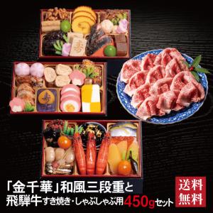 おせち 2026 飛騨牛セット 「金千華」 冷蔵 長方形 三段重 全33品 2人前 3人前 「飛騨牛」 冷凍 すき焼き しゃぶしゃぶ用 450g 送料無料 千賀屋