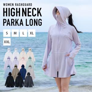 ラッシュガード レディース ハイネックパーカーロング丈 つば付き フェイスマスク 長袖 体型カバー UVパーカー 日焼け対策